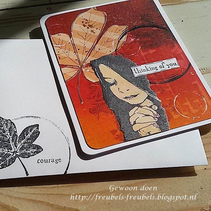 Voor de achtergrond heb ik drie kleuren disstres ink (wild honey, festive berries en aged mahogany) sponzend aangebracht van licht (onder) naar donker (boven). Zo ontstond een mooie heldere basis om op verder te werken. Het grote blad is een plaatje, door hetzelfde blad op de enveloppe te stempelen werd het een echt setje. De ontvanger vertelde mij vanmorgen een traantje te hebben weggepinkt bij het zien van het kaartje. Wat fijn te horen dat je iemand kunt roeren en raken met je creatie!
